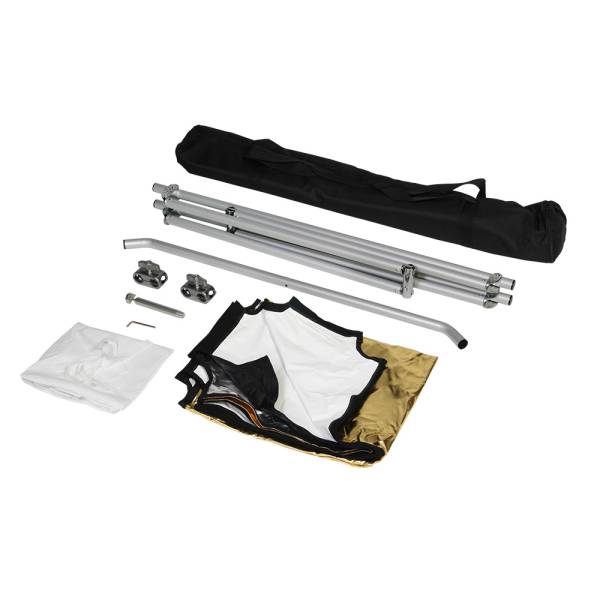 Отражатель на раме GreenBean ReflectPanel 5 RP1015 складнойОтражатель на складной раме, 5 в 1: просветный, серебристый, черный, золотистый, белый. Размер рамы 100х150 см.Отражатель на сборной раме GreenBean ReflectPanel 5 RP1015 предназначен для управления освещением в самых сложных ситуациях, подходит для использования как в студии, так и на локации. Используется для подсветки отраженным светом от основного источника деталей, расположенных в тенях или наоборот, уменьшения светового потока с помощью черной ткани, а также для сглаживания светотеневого рисунка с помощью просветной ткани. Размер рамы 100х150 см, 5 в 1: просветный, серебристый, черный, золотистый, белый. Складная конструкция отражателя состоит из прямоугольной рамы-каркаса, изготовленной из легкой алюминиевой 25 мм трубки. Рама имеет четыре шарнирных соединения в углах и по одному шарниру с фиксацией в разложенном положении на каждой из длинных сторон. Чехол из просветного белого материала или чехол с четырьмя разными отражающими поверхностями натягиваются на собранную раму. Чехлы прошиты по периметру тесьмой и имеют отверстия для установки рукоятки-растяжки. Для установки отражателя на стенд или другой держатель, на С-образной рукоятке расположен установочный палец диаметром 17 мм. В комплекте поставляется удобный чехол на молнии для хранения и транспортировки отражателя, размер чехла 110х16х16 см. Комплект поставки