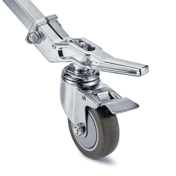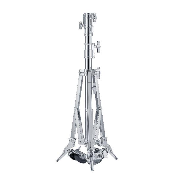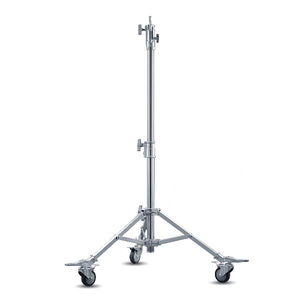 Стойка Godox SA5015 на колесахСтойка Godox SA5015 на складной колесной опоре позволяет надежно устанавливать и легко перемещать различные студийные осветительные приборы весом до 40 кг. Очень прочная и устойчивая стальная стойка может использоваться как в студии, так и на любой съемочной площадке, в том числе под открытым небом.Godox SA широко применяются для установки источников постоянного света в муфту с креплением 1-1/8" Junior на конце стойки. Также благодаря выдвижному поворотному штифту 5/8", можно закреплять различное дополнительное оборудование и аксессуары – рассеиватели, флаг-панели и т.д. Высота стойки в рабочем состоянии от 92 см до 168 см обеспечивается выдвижением телескопической секции колонны с усиленными винтовыми зажимами. Секции колонны изготавливаются из трубы большого диаметра 42 и 48 мм, обеспечивающими высокую грузоподъемность. Секции оснащены пружинным амортизатором, который дает возможность безопасно поднимать и опускать установленное оборудование на необходимую высоту, не опасаясь последствий падения оборудования из-за случайного ослабления зажимов. Конструкция одной из трех ножек помогает выравнять стойку на рельефной или наклонной поверхности. Нагруженную стойку просто переместить благодаря устойчивой колесной опоре с тремя колесами с тормозным механизмом. Большие легко вращающиеся колеса Ø100 мм оснащены с подшипниками и резиновым протектором, чтобы преодолеть такие препятствия, как кабель-каналы или другие неровности. Тормозной механизм убережет стойку от случайного перемещения. Мобильная стойка в сложенном виде имеет длину всего 90 см, подходящую для компактного хранение и перевозки. Особенности