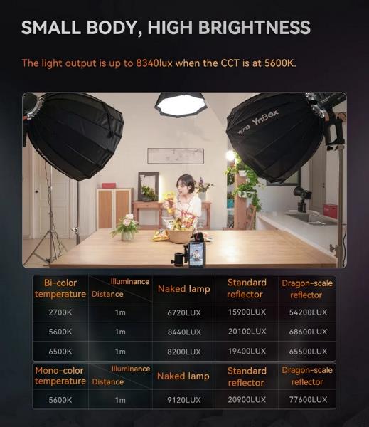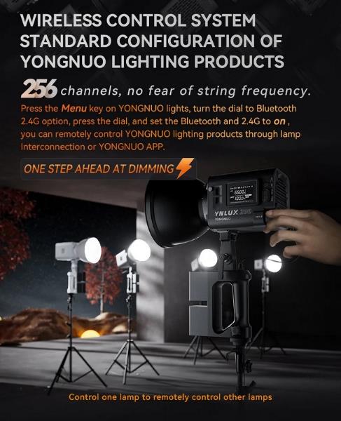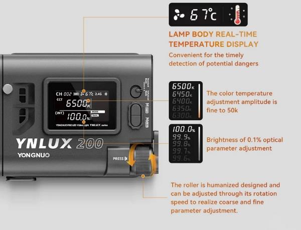 Осветитель YongNuo YNLUX200-KIT 2700-6500KЕще мощнееЕще более мощная и современная версия ультракомпактного моноблока серии LUX от YongNuo обзавелась усовершенствованной матрицей диодов, что позволило увеличить мощность до 200 Вт, а также получить улучшенную цветопередачу для профессиональной работы. Осветитель имеет байонет Bowens, а также несколько встроенных FX режимов для создания видео эффектов Расширенный комплект В расширенную комплектацию LUX200 входит отражатель, для создания более яркого светового потока. Для подключения питания можно воспользоваться сетевым адаптером при работе в студии, либо батарейной рукояткой на два аккумулятора NP-F для автономности. Бережно и удобно хранить набор оборудования поможет кейс Интеллектуальное охлаждение Кулер активного охлаждения прогоняет воздух через все важные элементы, обеспечивая равномерную теплоотдачу. Интеллектуальная система сама распределит нагрузку, а низкий уровень шума всего в 25 дБ, позволяет записывать звук прямо со сцены Удобное управление Панель управления перенесена на боковую сторону, а большой дисплей поможет в настройке параметров. Также предусмотрена возможность контролировать LUX200 через фирменное приложение прямо с экрана смартфона Комплектация: