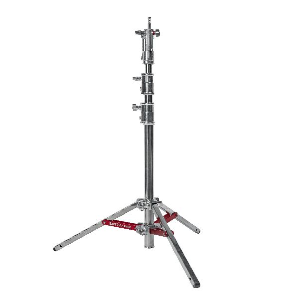 Стойка-тренога Falcon Eyes LVR-2400 на колесахFalcon Eyes LVR-2400 – стальная стойка-тренога, в комплекте с шаровой мини-головкой для установки цифровых фото и видеокамер.Трехсекционная профессиональная стойка высотой 118-238 см с пружинной амортизацией выдерживает нагрузку до 30 кг. Для удобного перемещения по студии предусмотрены резиновые колеса с тормозным механизмом. Прочная стойка, изготовленная из нержавеющей стали, может использоваться в студии, съемочном павильоне и на выезде. Адаптеры крепления Стойка LVR-2400 имеет различные варианты адаптеров крепления: адаптер Baby Pin 5/8", муфту с креплением 1-1/8" Junior и шаровую головку. Пружинный штифт Baby Pin 5/8" на винтовом фиксаторе мгновенно выдвигается и позволяет установить шаровую мини-головку, которая предназначена для панорамирования камерой на 360°. Стальная телескопическая колонна Центральная стальная колонна поделена на три секции диаметром 48/42/35 мм, которые соединяются между собой металлическими винтовыми зажимами. Положение нижней секции колонны регулируется с помощью винта в зоне растяжки треноги. Изменение положения центральной колонны обеспечивает дополнительную жесткость опоры и регулировку высоты стойки. Телескопическая колонна также оснащена пружинной амортизацией для защиты оборудования от внезапного падения, если ослабнет фиксирующий зажим. Тренога с колесами Устойчивая тренога из стальных труб профилем 25х25 мм имеет размах в рабочем положении 106 см. Стойку можно использовать как стационарную или мобильную за счет съемных колес. Резиновые колеса Ø100 мм с тормозами имеют свободный угол вращения и плавный ход. Тормозной механизм убережет стойку от случайного перемещения. Чтобы установить и закрепить гайкой колесо на ноге стойки, необходимо предварительно зафиксировать его рычагом тормоза. Особенности: