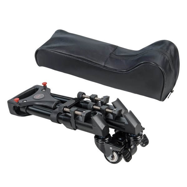 Назначение тележки Операторская тележка PT-15 предназначена для создания плавного, стабилизированного движения камеры во время видеосъемки. С ее помощью выполняют профессиональные приемы: проводки камеры по прямой и по дуге, а также повороты вокруг объекта. Модель будет полезна видеографам как в студии, так и на выезде, где важны точное позиционирование и быстрая смена ракурсов. Конструкция и материалы Основу тележки составляет каркас из легкого алюминиевого сплава, что обеспечивает высокую прочность при малом весе (1,75 кг). Прочные пластиковые элементы в менее нагруженных узлах и резиновые колеса делают конструкцию практичной, не добавляя лишней нагрузки при транспортировке оборудования. Телескопическая платформа и крепление штатива Модель PT-15 предназначена для работы со штативами, оснащенными обычными ногами и резиновыми наконечниками. Надежную фиксацию оборудования обеспечивают винтовые зажимы с подпятниками, которые плотно обхватывают опоры и предотвращают смещение во время движения. Регулируемый радиус платформы от 68 до 94 см позволяет оптимально размещать оборудование разных размеров. Телескопическая система ног фиксируется клипсовыми механизмами: для изменения диаметра платформы достаточно ослабить фиксаторы и выдвинуть секции на нужную длину. Система складывания и переноски Тележка быстро раскладывается — ноги фиксируются в рабочем положении щелчком подпружиненных кнопок. Для складывания достаточно поднять фиксаторы и сложить конструкцию, зафиксировав ноги лентой-липучкой. В сложенном виде тележка занимает минимум места и убирается в идущий в комплекте чехол на молнии. Центральный узел служит удобной ручкой для переноски сложенной тележки. Колесная база и маневренность Три резиновых колеса диаметром 50 мм гарантируют плавный и бесшумный ход, что особенно важно при видеосъемке. Благодаря повороту колес на 360 градусов тележка обладает высокой маневренностью в ограниченном пространстве. На каждом колесе установлен индивидуальный тормоз для надежной фиксации во время работы. |